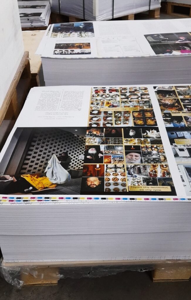Ιδιαίτερα εντυπωσιακό είναι το εσώφυλλο, τυπωμένο σε Stucco Acquerello 170 gsm, χαρτί με ξεχωριστή υφή και χρυσή θερμοτυπία του λογότυπου επάνω σε μωβ πλακάτο χρώμα — ένας συνδυασμός που αποπνέει κομψότητα και φροντίδα στη λεπτομέρεια.