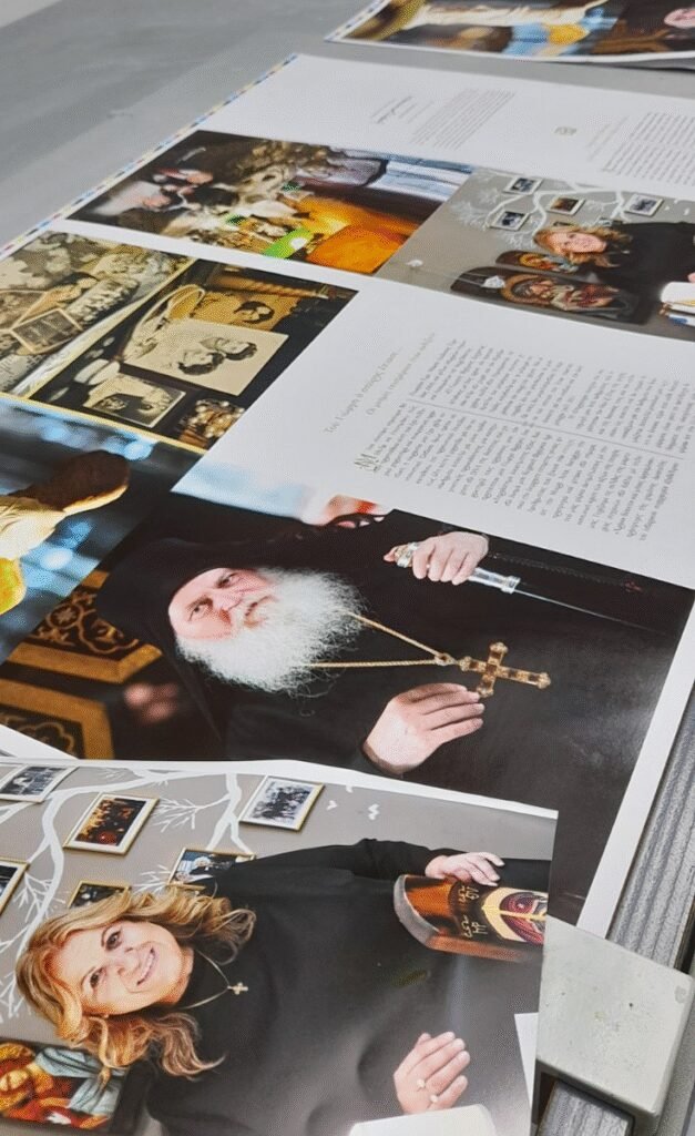 Η κουβερτούρα είναι τετράχρωμη, επίσης σε Stucco Acquerello 170 gsm, με Mat πλαστικοποίηση. Tο τοπικό UV στη λεπτομέρεια του ψηφιδωτού του Αρχαγγέλου Γαβριήλ δίνει μια διακριτική λάμψη που προσθέτει βάθος και πολυτέλεια.